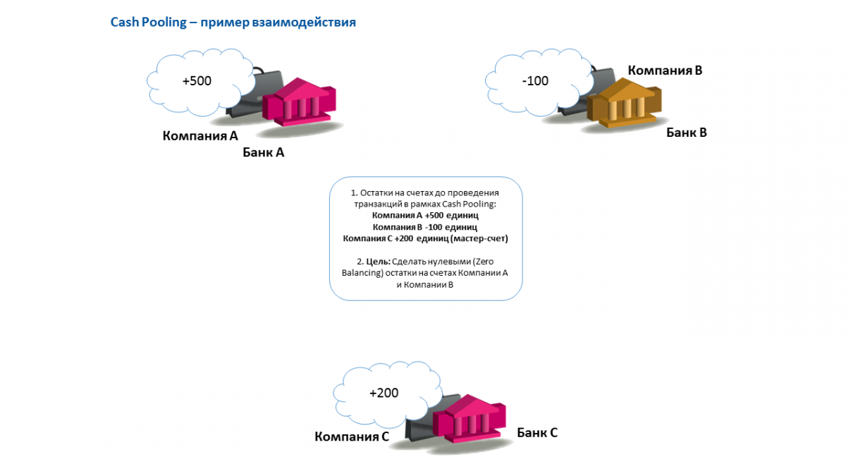 Иными словами, вся холдинговая структура или группа компаний, которая хочет получить эффект от внедрения Cash Pooling, вынуждена открывать счета в одном определенном банке и держать в нем большую часть средств. Но на практике это не работает, так как у компаний, как правило, существуют кредитные обязательства перед другими банками, выраженные в поддержании определенного уровня оборотов или остатков на счетах, да и с точки зрения диверсификации нежелательно держать всю ликвидность в одном банке.