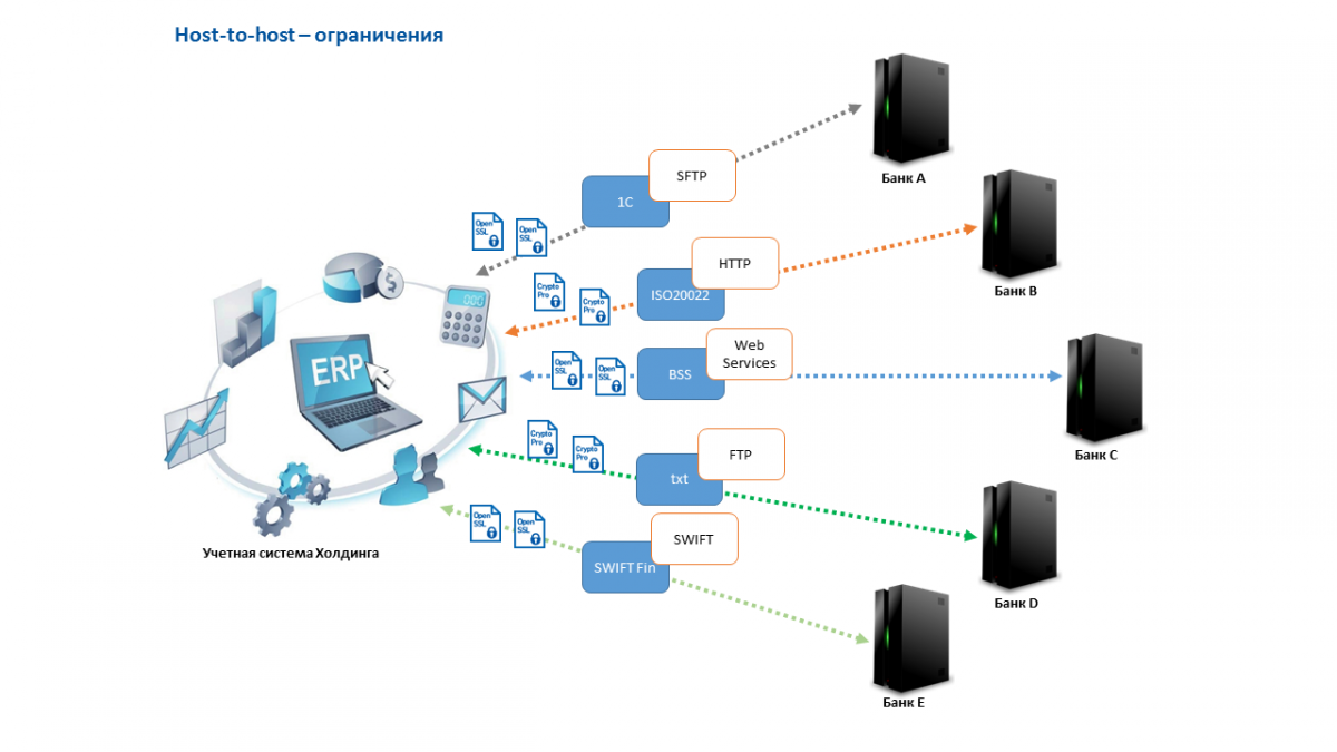 И даже использование прямой интеграции учетной системы клиента с банком (Host-to-Host) полностью не решает задачу, так как каждый банк предлагает клиенту свой канал обмена данными, определенные форматы и определенные средства криптографической защиты информации.
